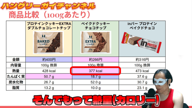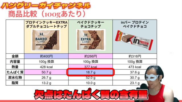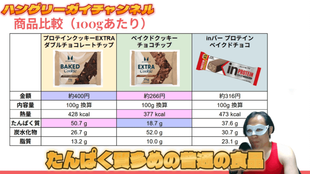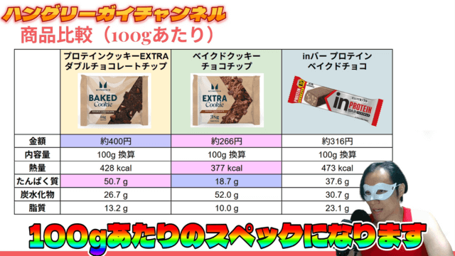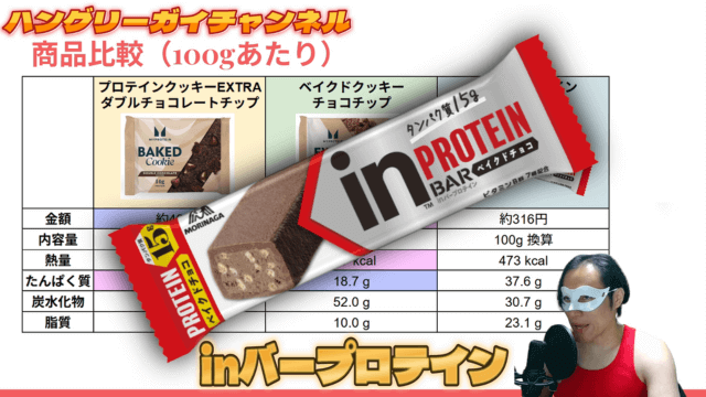 「ベイクドクッキー」が同社の「プロテインクッキー」や、日本において定番で一般的なプロテインバーである森永「inバープロテイン」と比較してどのようになっているかを確認するために、栄養成分などのスペックを表にまとめ、内容量100gあたりの数値に調整をして比較するとわかる点をいくつかピックアップしていきます。