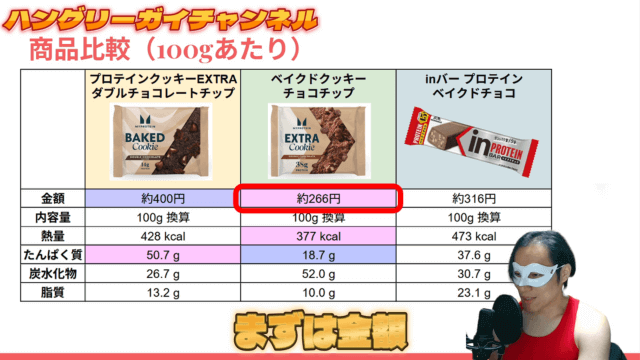まずは金額を比較してみると、ベイクドクッキーは最も安価な数値となっており、一般的なプロテインバーと同じような感覚で食べたとしても、コスト自体はそこまで大きくならないのは良いポイントであると言えます。